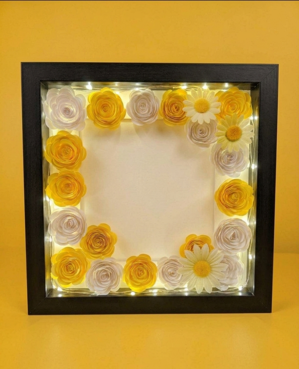 A customized shadow box with a arrangement of handmade daisies all put togther in any shape with room for a picture. This one comes with built in lights that can be turned off and on.